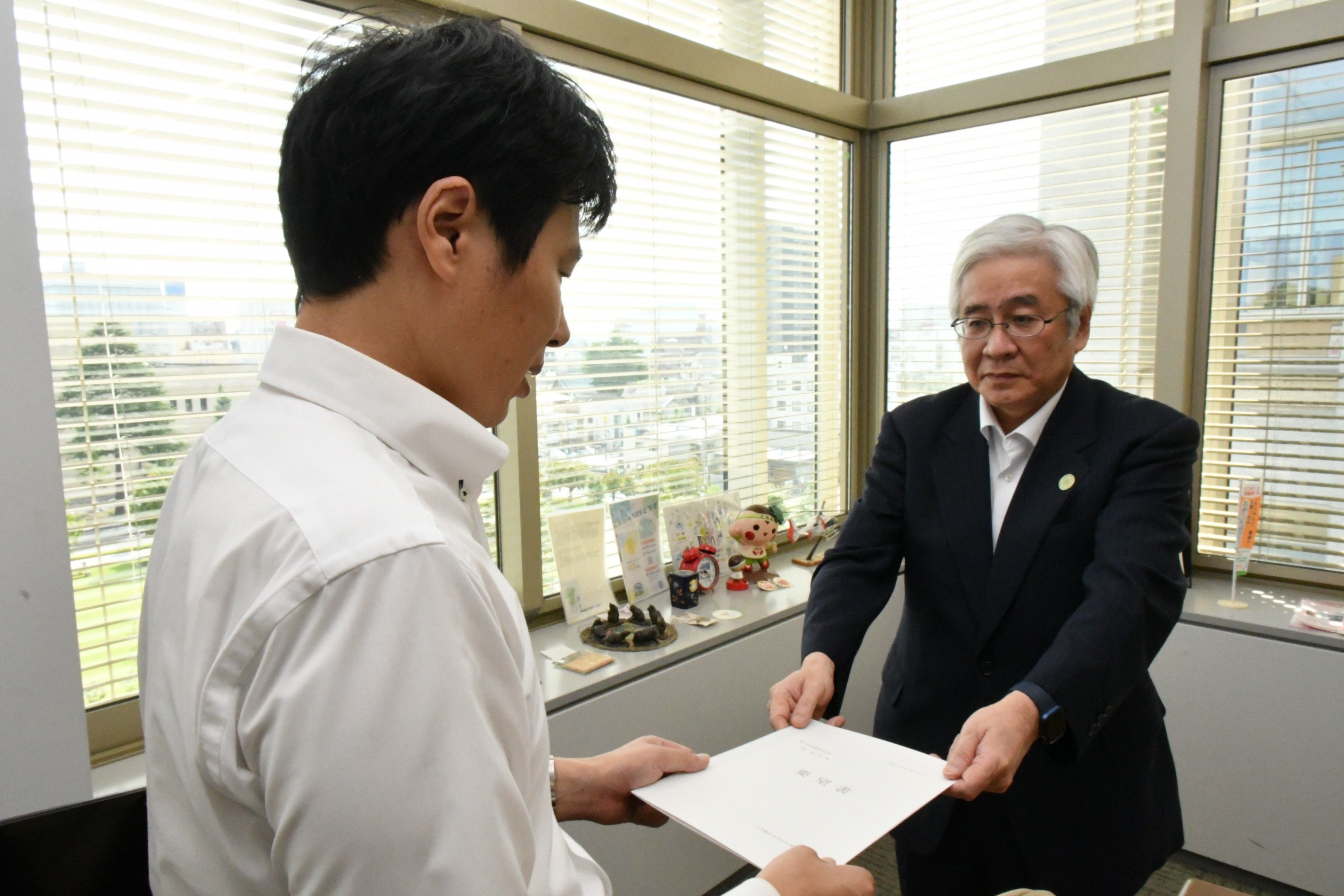 岩佐景一郎県保健福祉部長(左)に消化器外科医確保に向けた要望書を提出する日本臨床外科学会の尾澤県支部長=9月、県庁