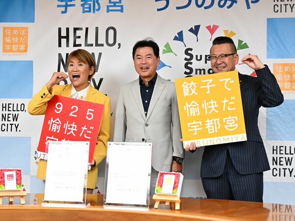佐藤市長(中央)から委嘱状を受け取った山田さん(左)と鈴木さん=25日午後、宇都宮市役所