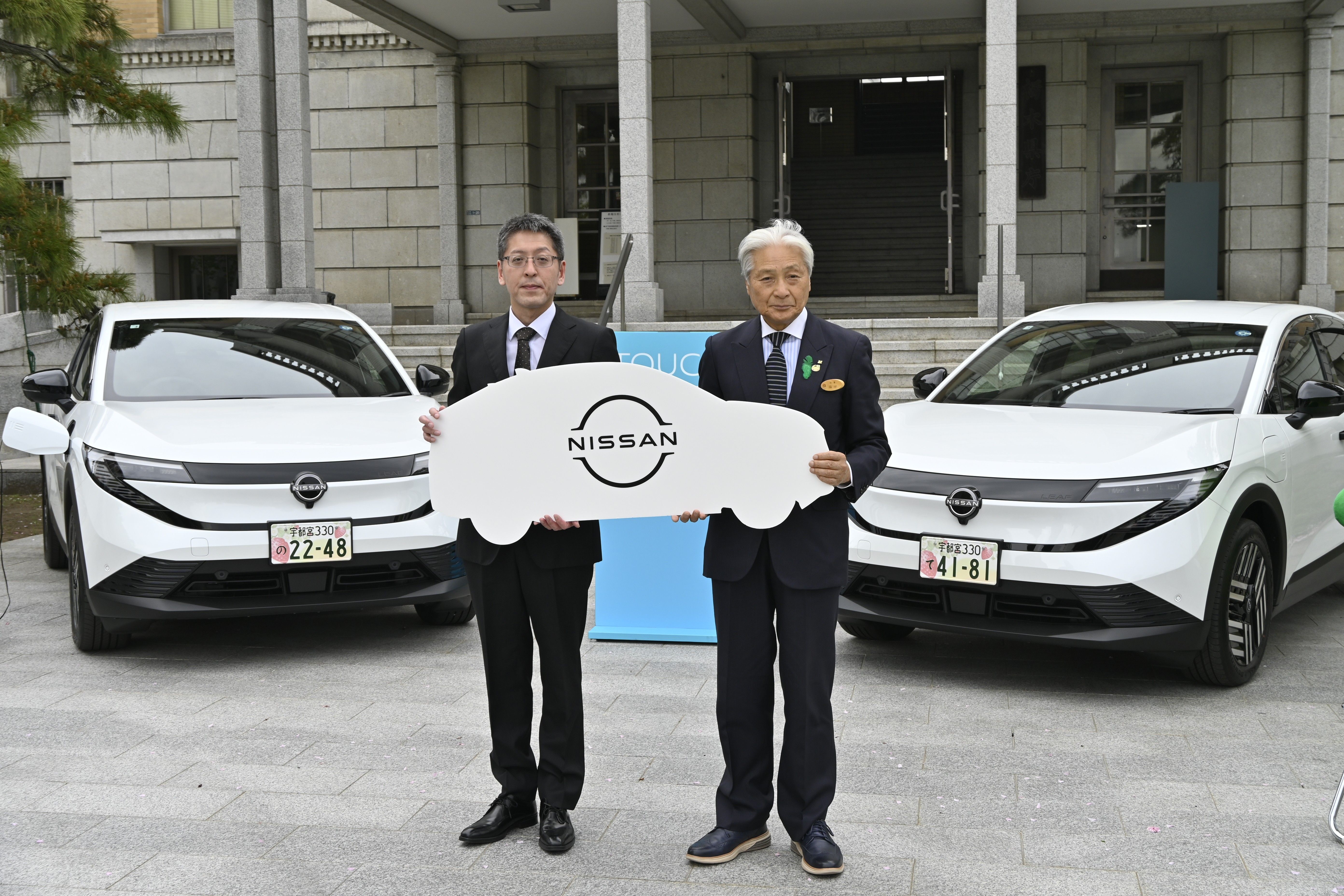 リーフの納車を記念して江口工場長(左)からパネルを受け取った福田知事=22日午後、県庁